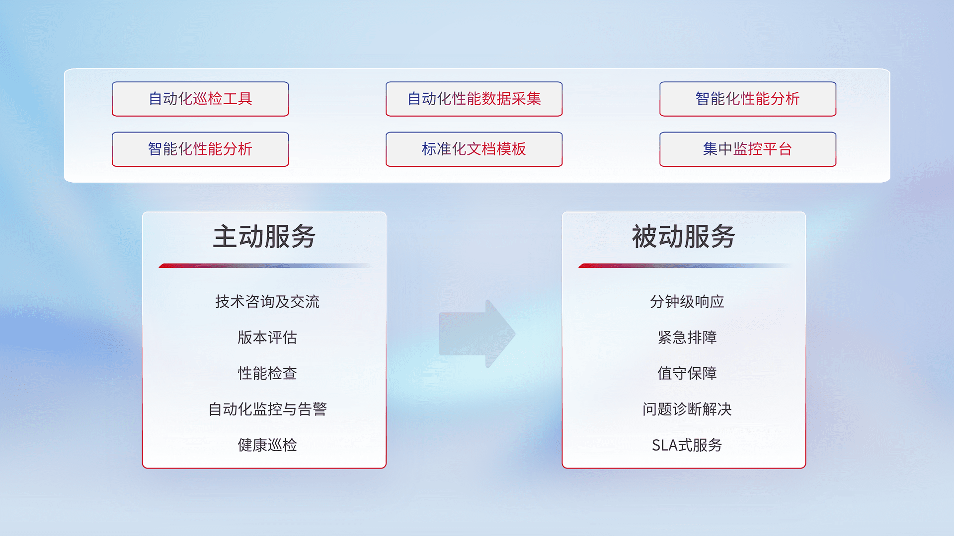 智能化工具和标准化文档,,,保障服务质量,,,,提供主动服务(包含技术咨询、、、版本评估、、性能检查、、自动化监控与告警、、、、健康巡检)和被动服务包含(分钟级响应、、紧急排障、、值守保障、、、问题诊断解决、、、、SLA服务)。。